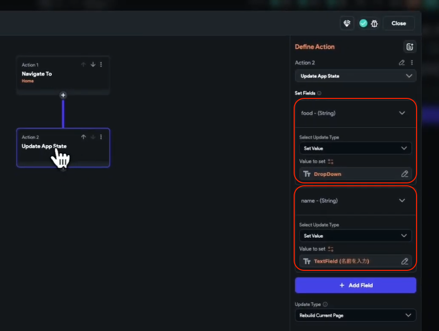 次に、「次の画面へ」ボタンを押したときに、App Stateに値を保存するアクションを追加します。