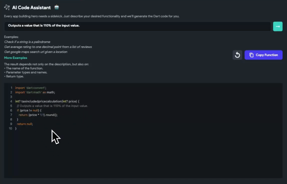 FlutterFlowには「コードコパイロット」があり、英語で説明文を入力するだけでDartコードを自動生成できます。